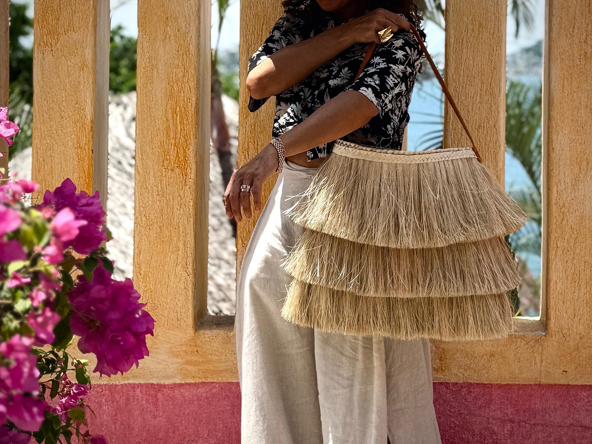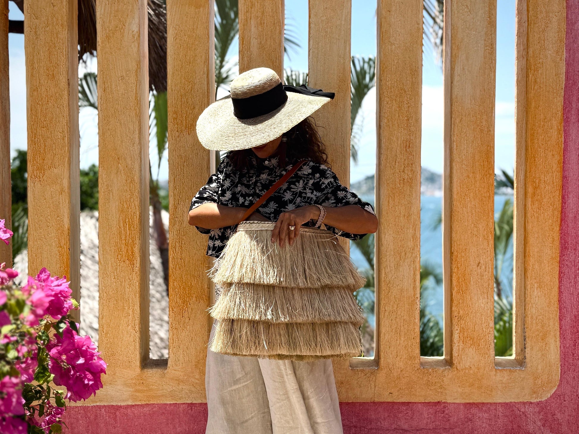 La Bolsa Brisas está tejida a mano en palma natural por artesanas de Guerrero, con un diseño de tres niveles de barbas que fluyen con movimiento y ligereza, como el viento que acaricia la costa.
