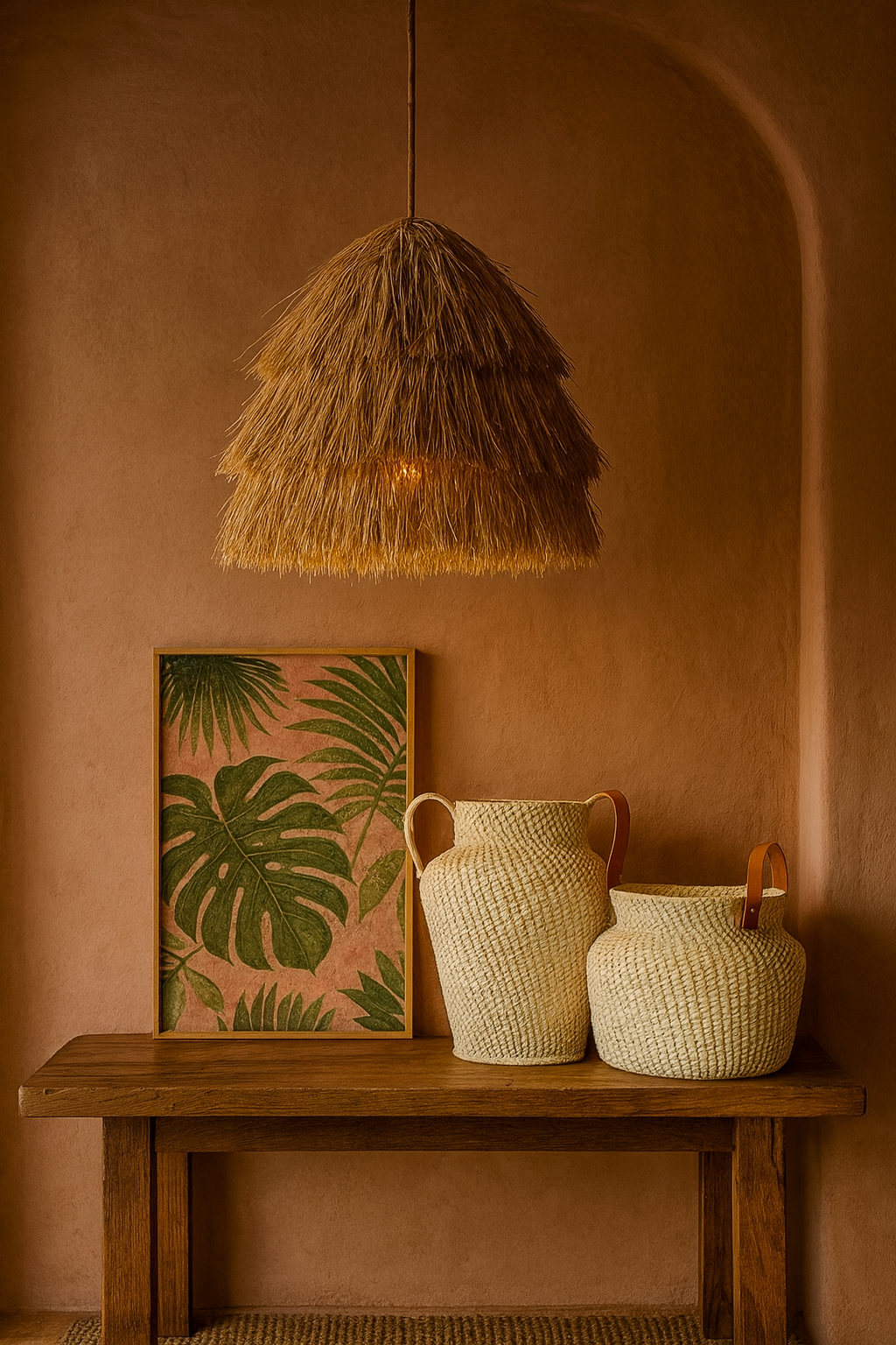La Lámpara de palma natural con forma de pino es una pieza de iluminación artesanal de lujo que transforma cualquier espacio en un refugio sofisticado. Tejida a mano por artesanos mexicanos, su silueta orgánica evoca la elegancia de la naturaleza tropical y eleva la atmósfera con una luz cálida, envolvente y auténtica.